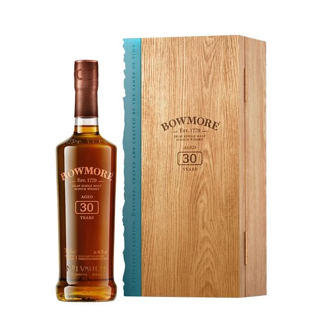 Dieser Bowmore reifte 30 lange Jahre in Bourbon- und Sherryfässern. Nach 30 Jahren in den besten Fässern verbindet sich der Bowmore-typische intensive Islay Rauch harmonisch mit tropischen und süßen Aromen.