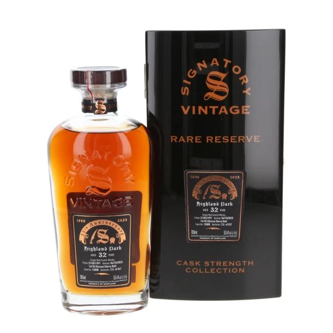 Der Highland Park 35th Anniversary Single Malt ist Teil der Cask Strength Collection von Signatory Vintage, die als Rare Reserve Serie zum 35. Jubiläum des unabhängigen Abfüllers von Andrew W. Symington kreiert wurde. Signatory ist seit 35 Jahren einer der erfolgreichsten unabhängigen Abfüller aus Schottland. Symington und sein Team spüren seit jeher seltene Whiskyfässer aus bereits geschlossenen Brennereien-, gefragte Single Malts aus Destillerien, die keine Fässer mehr ausgeben, oder Brennereien auf, die unter eigenem Namen gar keine Whiskys veröffentlichen. In der 35th Anniversary Edition präsentiert der unabhängige Abfüller exklusive Single Casks mit hohem Alter, die aus namhaften Destillerien von Islay, den Orkney Islands, der Speyside oder aus den Highlands stammen. Die fassstarken Abfüllungen werden in hochwertige Holzschatullen verpackt und mit einem von Andrew W. Symington unterzeichneten Echtheitszertifikat geliefert, was die Exklusivität jener Whiskys neben der naturbelassenen Farbe unterstreicht. Dieser 32-jährige Single Malt aus der Highland Park Brennerei wurde 1991 destilliert und verbrachte seine gesamte Reifezeit in einem First Fill Sherry Butt.